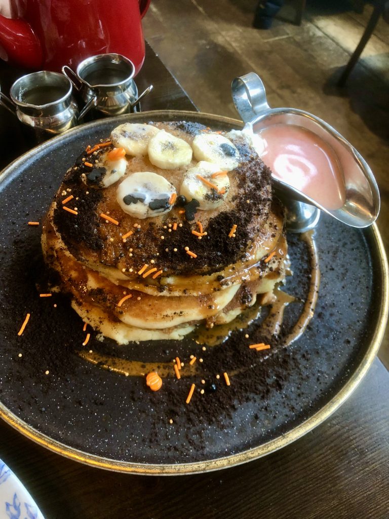 Parce qu’on ne saurait finir un bon brunch sans une touche sucrée, nous partageons les pancakes d’Halloween. 5 pancakes pour 4, petit court de maths ? Pas le temps.