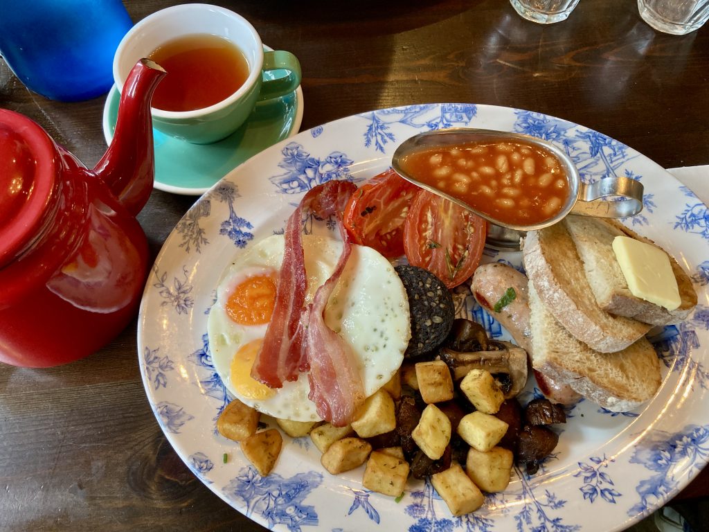 De retour sur les traces de Sherlock et Watson, nous repérons rapidement le restau en question, il y a du monde qui fait la queue. Réservation en poche, nous pénétrons dans les lieux où règne un gentil brouhaha du dimanche, bruit mol de la fourchette découpant les pancakes, petit doigt levé en portant la tasse de thé à la bouche, odeur de bacon, défilé de serveurs aux plateaux garnis d’assiettes gourmandes.