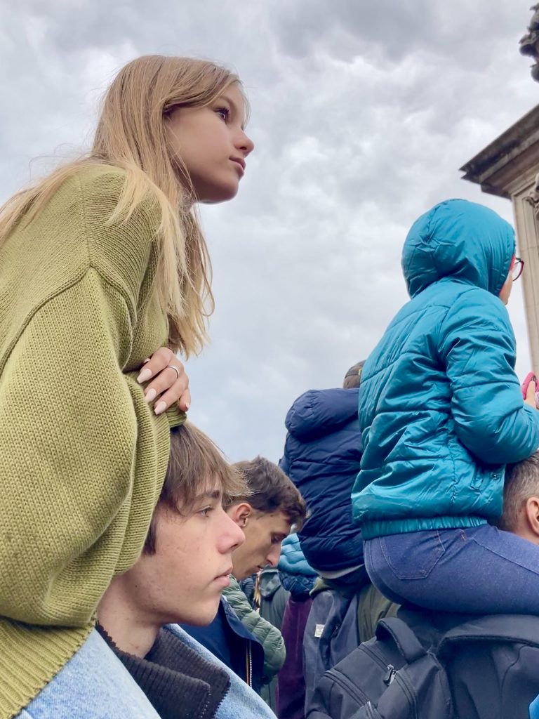 La suite se passe hors de notre vue, au son des ordres militaires beuglés par delà les grilles du palais. Hélas la masse de badauds bien plus matinaux que nous forme un rempart rédhibitoire. Valentin se sacrifie pour permettre à sa sœur d’apercevoir la cérémonie.