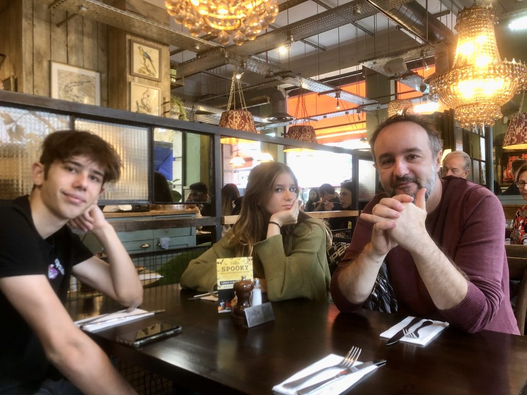 Vers 20h, les dents creuses d’Alix et Val sonnent la charge, je propose à Elsa de ressortir les nourrir tandis que le brunch de Bill semble largement lui suffire pour aujourd’hui. A cette heure-ci les opportunités sont rares. J’ai repéré un Wagamama à proximité, lequel ne ferme qu’à 22h. Ouf. C’est une chaîne de restaurants d’inspiration japonaise, ambiance soupes, nouilles, gyozas et autres tempuras. Le menu s’avère très visuel et les enfants scotchent sur une photo de soupe composée de plein de trucs appétissants. Lors de la commande, ils glissent leurs instructions à la serveuse : « this soup, please, but without chilli and without coriander ». La serveuse tique, si on retire le piment (chilli) la soupe n’a plus trop d’intérêt, autant choisir une autre recette. Plutôt crever que de manger un truc visuellement différent ! A ma grande surprise, Sylvain et Sylvette acquiescent et valident la version pimentée de cette soupe et ses Gyozas au poulet. Par contre ils insistent pour le retrait de la coriandre. Donc c’est parti pour une commande de 3 bols identiques, dont 2 sans coriandre. Valentin se charge les boissons : une eau gazeuse pour son père et 2 « tropicals » (des sortes de jus de fruits, là aussi avantageusement mis en image sur le menu).