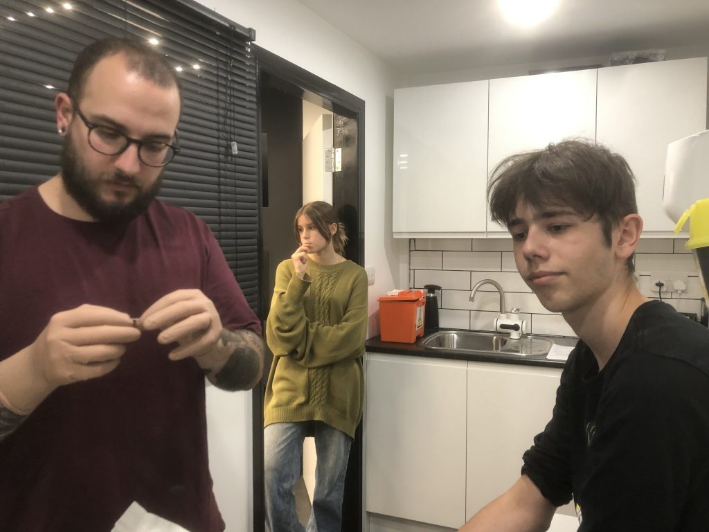 Nous entrons dans le salon, cliniquement propre et décoré avec goût. Une jeune fille tatouée nous accueille au comptoir. Comme beaucoup d’anglaises elle porte d’énormes faux cils qui lui alourdissent le regard ; je ne suis pas fan de cette tendance de l’œil poilu, je trouve que ca donne un air torve, enfin bref. La demoiselle nous informe que Valentin va pouvoir se faire trouer l’oreille sans problème, mais que le nez d’Alix restera vierge de toute breloque : la législation anglaise ne rigole pas avec ça, pas avant 16 ans. Alix se met illico à bouder tandis que Val s’installe dans le cabinet du perceur, un gars sympathique qui nous met tout de suite à l’aise. Il s’accorde avec Val sur l’emplacement de la future boucle, dégaine son matériel stérilisé, et hop, poinçonne l’oreille du Vava qui subit l’épreuve sans ciller. Le résultat est top : ça lui va super bien, nous sommes tous unanimes là-dessus, même la Lilix qui interrompt brièvement sa bouderie pour féliciter son frangin.