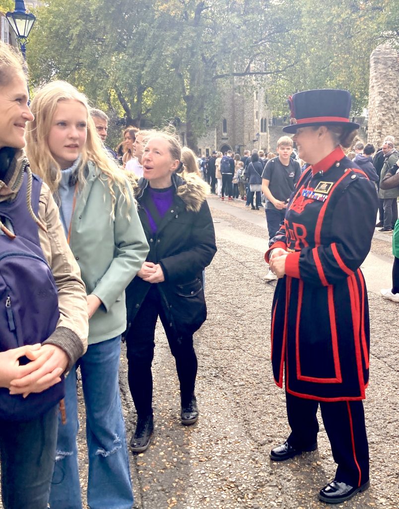 Nous rentrons dans l’immense domaine de la Tower. Plusieurs bâtiments composent l’ensemble ; tout cela est ceint d’un chemin de garde depuis lequel on peut admirer la Tamise et le Tower Bridge. Nous flânons en devisant plus ou moins intelligemment, l’ambiance est détendue et débonnaire, le soleil joue à cache-cache derrière de gros cumulus blancs et joufflus… C’est très agréable. Nous croisons souvent des Beefeaters, ces gardes (hommes ou femmes) parés de leur tenues typiques, dont le rôle est de veiller à la bonne tenue et à la sécurité du site. Ces joyeux lurons ne sont pas, nous apprend Matthieu, l’équivalent de Dingo et du Capitaine Crochet à Eurodisney. Non : ce sont les fiers représentants d’un ordre militaire spécialement conçu pour la Tour de Londres, ils touchent une solde pour cela et vivent même en famille dans l’enceinte du site. Ils en détiennent les clés, et ouvrent et ferment la lourde lors d’une cérémonie aussi protocolaire qu’alambiquée.