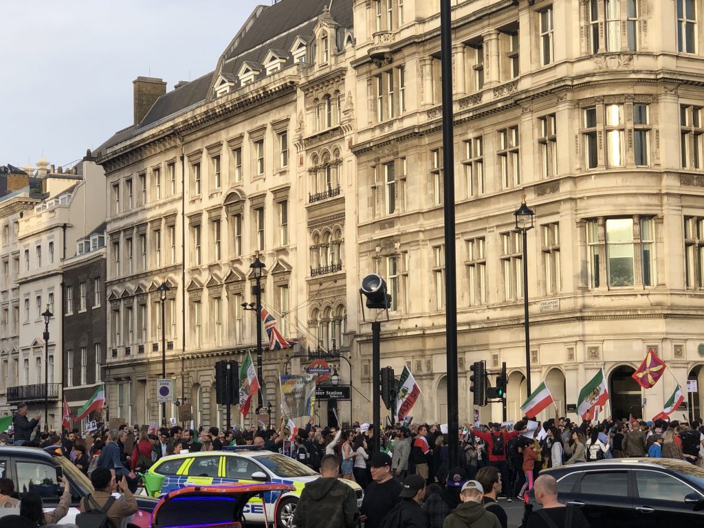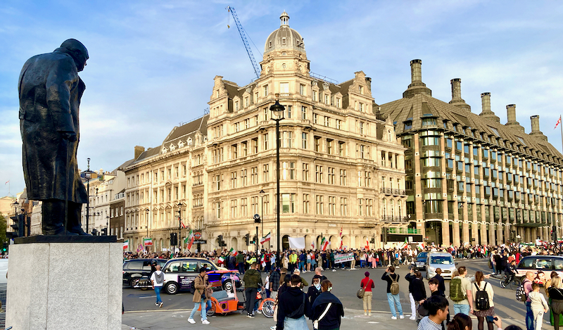 Nous voilà devant l’Abbaye de Westminster, que nous ne visitons pas car l’entrée coûte un œil, puis Big Ben, qui est plutôt laid mais qui a le mérite de donner l’heure. Mais ce qui retient notre attention se trouve sur la chaussée : des milliers de manifestants défilant plutôt calmement pour la libération de l’Iran, et des policiers en uniforme que l’on sent un peu sur les dents – mais qui conservent leur flegme quand même, on est en Angleterre.