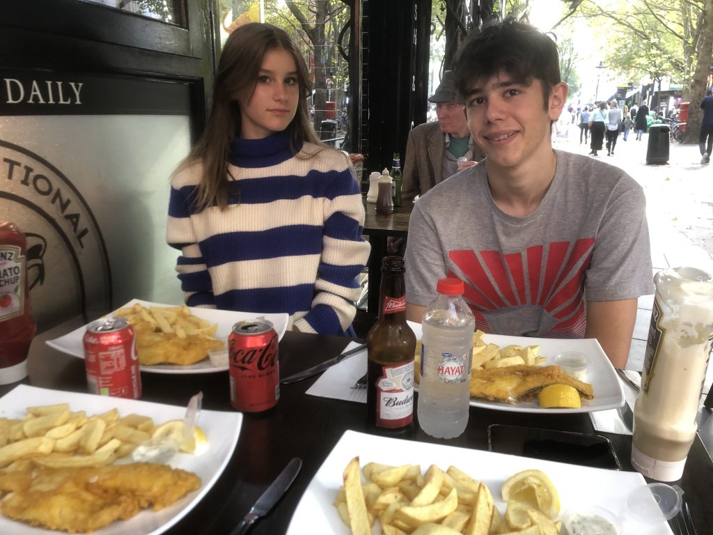 Plus au nord, retour chez les prolos, il est 15h passées et le porridge de ce matin est loin ; on a les crocs. Nous jetons notre dévolu sur un fish&chips donnant sur le boulevard, chez Ben, et sommes installés par Ben himself, la classe. Nous nous tapons le plat typique avec plaisir, même si l’assiette est relativement monochrome : on consomme du jaune – poisson pané, frites, mayo et bière, pour les 5 fruits et légumes on repassera.