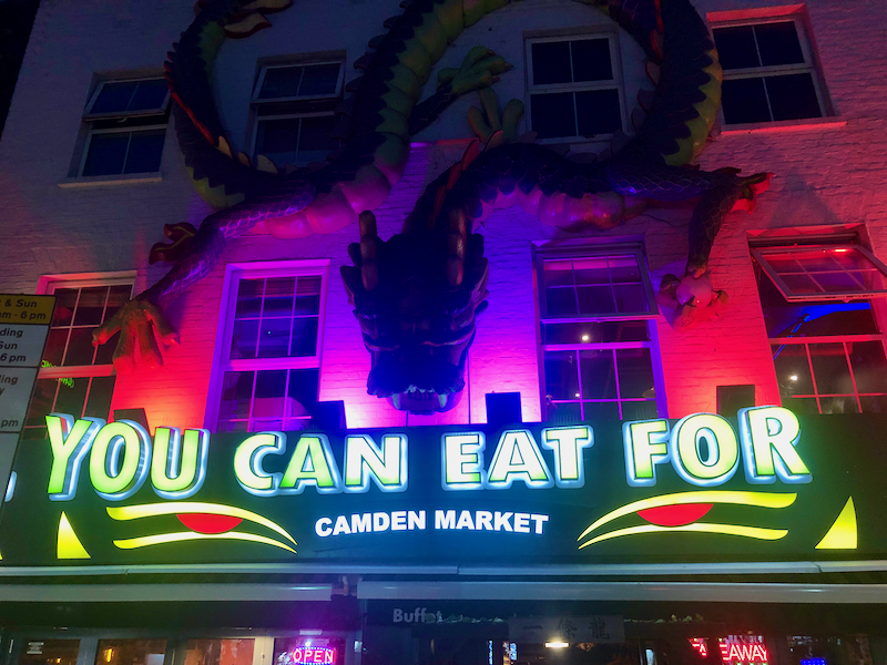 Nous revoilà dans le métro, en route vers Camden Town. Nous avions aimé ce coin rigolo et alternatif et avons bien envie de retourner l’explorer plus profondément. Il y a un monde fou – samedi oblige – et nous prenons plaisir à faire du lèche vitrine en slalomant entre touristes et locaux, dans des effluves de weed et de graillon. Le temps passe, le soleil décline, le taux d’alcoolémie général augmente ; nous assistons à quelques bastons (ils y mettent du coeur quand ils sont pas contents les angliches) et admirons des punks faire la manche en brandissant, rigolards, des panneaux de carton sur lesquels on peut lire “help a punk to get drunk”.