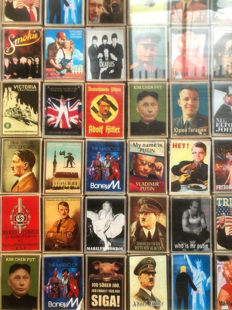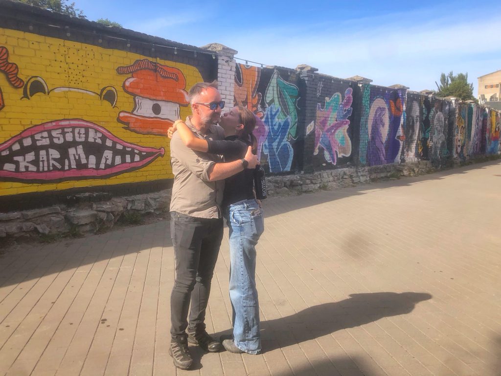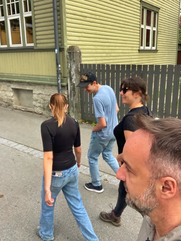 Le car part à 22h30 depuis la gare routière qui est à 40 minutes de marche au sud-est de notre appart. Pourtant, nous mettons le cap sur la gare ferroviaire qui se trouve à 40 minutes à pied dans le sens opposé. L’objectif : caler notre sac dans une consigne et aller visiter le quartier branchouille de Telliskivi qui se trouve juste derrière cette gare. Nous sillonnons une dernière fois la vieille ville de Tallinn, sous un beau soleil et la petite bise fraîche qui fait zizir, en écoutant les musiciens de rue, en regardant les groupes qui dansent et qui festoient ; décidément, c’est super sympa, un gros coup de cœur pour nous quatre. Nous nous paumons de nouveau, montant inutilement tout au sommet de la ville pour redescendre comme des cons 200 mètres plus loin, mais pas grave, au moins on aura fait la photo qui va bien.