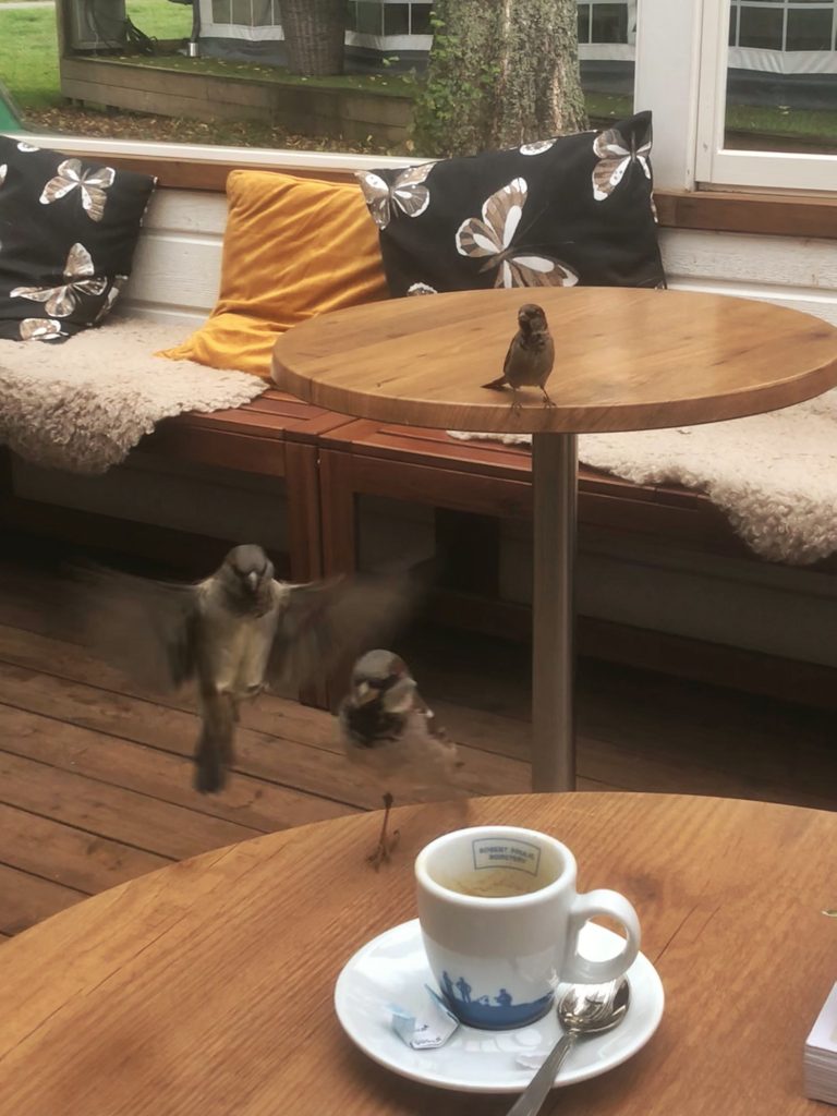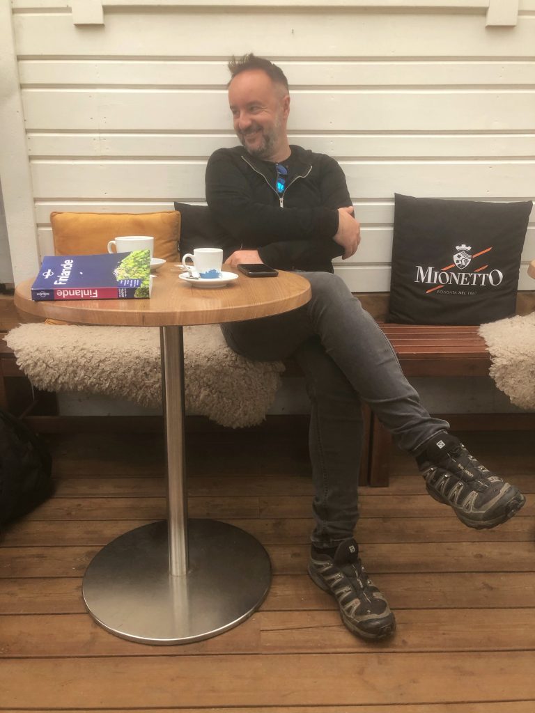 Nous quittons Nummela en direction d’un autre bled, à quelques kilomètres, lequel promet une vue sur un lac et un plan d’urbanisme un poil plus engageant. Nous faisons halte dans un café face au rivage. L’ambiance chaleureuse, les peaux se mouton, la playlist de jazz et la plage quasi-déserte désignent exactement le genre d’endroit espéré.