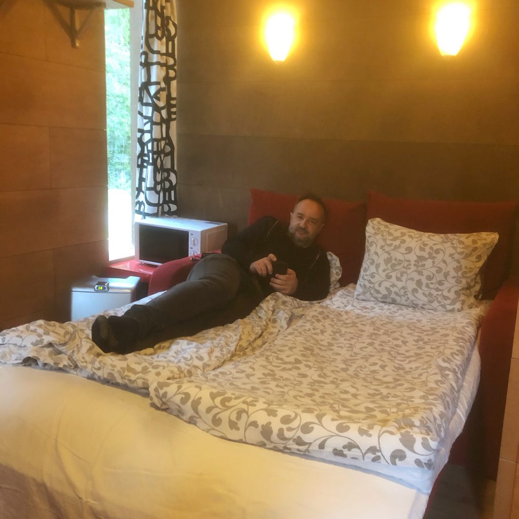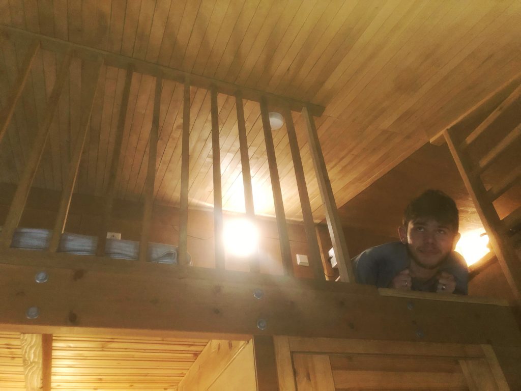 Puis c’est l’heure, nous allons pouvoir prendre possession de notre cabane. Notre hôtesse nous a prévenu qu’elle laisserait ouvert et serait absente. Nous découvrons le lieu en toute autonomie. La cabane jouxte 2 maisons, un bois et de grandes prairies. Blague du jour : pas de douche. Le coin salle d’eau comporte un WC et lavabo en taille XS. Il y a bien le tuyau d’un jet d’eau dehors, mais la motivation n’est pas là.