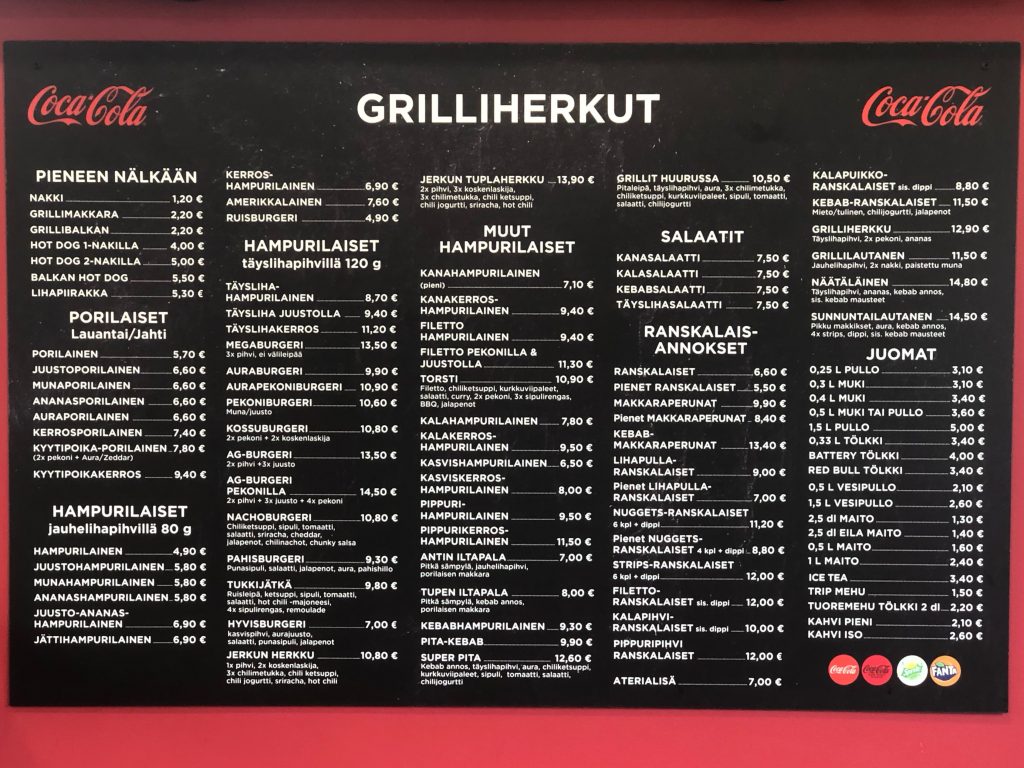 Les avis Google dénoncent le meilleur restau du coin, l’AG grill. On le trouve sans mal au milieu du complexe des supérettes. En fait, ce sont 2 Algecos pacsés à la va-vite. Le menu de ce fast-food est intégralement rédigé en finnois, les prix également bien sûr, et nous voici rendus à commander des burgers « sur plan » sans trop maîtriser ce qu’il y a dedans hormis leur prix déjà foufou.