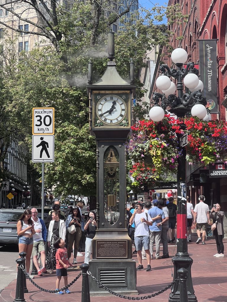 Pour l’heure, nous sommes dans cette rue agréable, ça sent le graillon typique nord-américain parfumé de tonalités asiatiques. Nous nous arrêtons devant une drôle d’horloge que photographient frénétiquement les touristes (là, pas de doute, ce sont des touristes), un hommage à ce quartier de Gastown qui fut longtemps un spot incontournable pour le transport maritime.