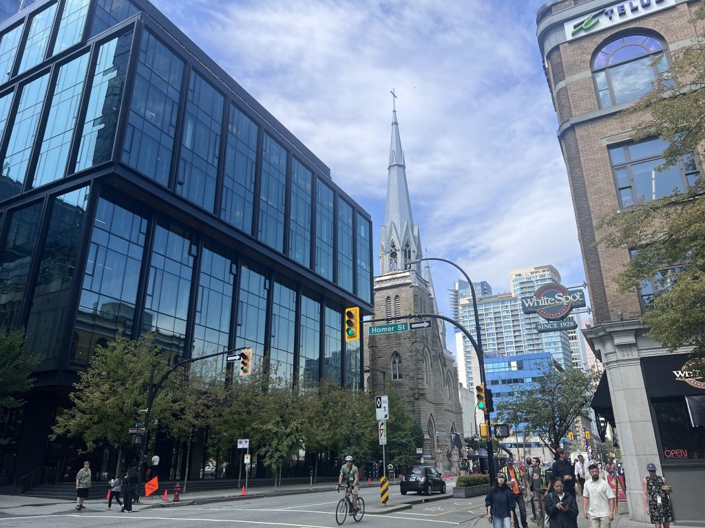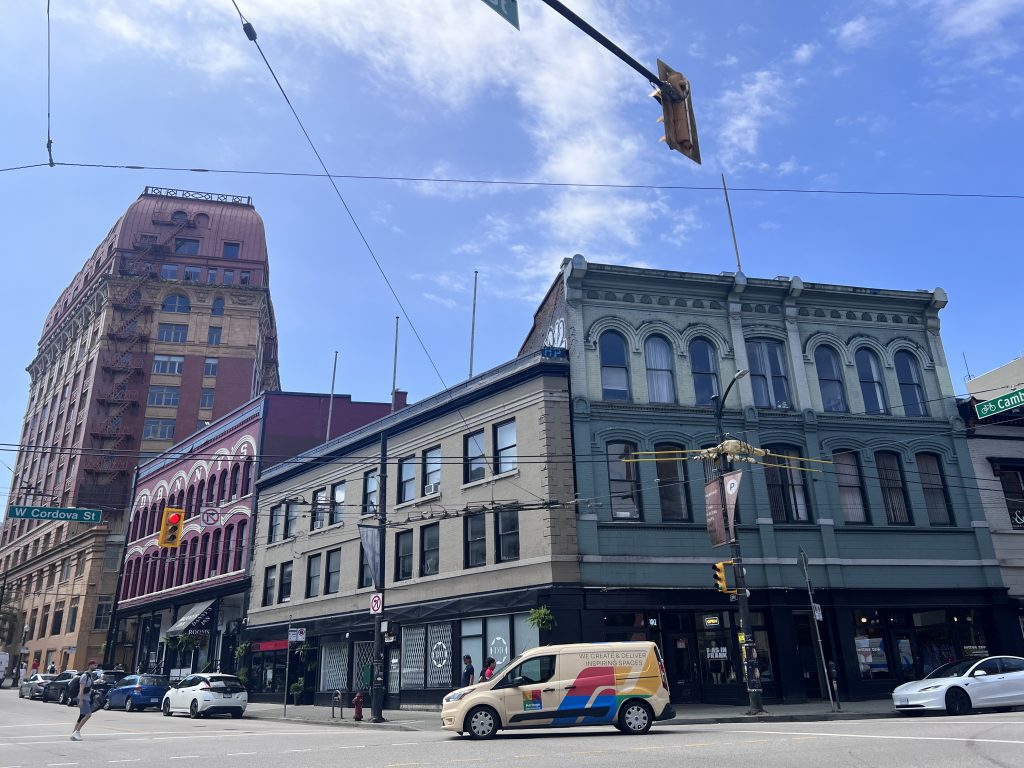 Nous arrivons au terminus de la ligne, sur le front de mer. Nous nous arrêtons sur un coin de trottoir et considérons la scène qui s’offre à nous. Nous voilà dans le quartier historique de Gastown, en bordure d’un des bras de mer qui ceignent la ville. De hauts buildings côtoient de plus petites bâtisses en briques rouges. Nous foulons des trottoirs couverts de larges plaques de béton comme nous les aimions à New York. Les touristes se mêlent aux locaux et il n’est pas toujours aisé de les distinguer ; les vancouverois que nous croisons ici sont sportifs, décontractés. La population asiatique est très présente ; nous apprendrons plus tard qu’elle représente plus de 54 % de la population du grand Vancouver, qui compte près d’un million d’habitants. La ville a vécu tout au long de son histoire plusieurs vagues d’immigration de populations chinoises notamment, mais aussi sud-asiatiques, et se targue d’être un exemple de diversité multi-ethnique et multiculturelle. Le quartier de Chinatown de Vancouver, que nous décidons d’aller écumer dès demain, compte d’ailleurs parmi les plus grands du Canada.