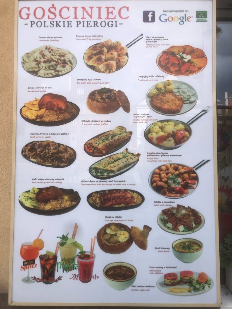 Gosciniec, ce n’est pas un vieil oncle breton qui écrirait des BD mais bien une chaîne polonaise de brasseries qui propose une carte de spécialités locales. Nous nous attablons pile au pied des ramparts où toutes sortes de touristes promènent leurs séants en rythme.