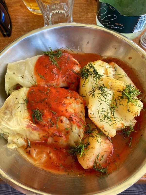 Alix choisit les ravioles, Elsa l’escalope panée/patates vapeur/concombres à la crème tandis que j’opte pour des paupiettes de choux garnies de riz et de viande. Val, on ne sait pas trop ce qu’il a choisi parce que de toute façon sa commande sera ignorée. Il passera le repas à picorer dans nos assiettes tandis que son plat arrivera exactement pour le dessert.