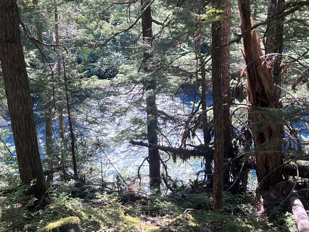 En bordure de chemin et tout à côté de la rive, nous croisons quelques emplacements de camping quasi sauvage. Ces emplacements sont à peine assez grands pour abriter une tente et deux petites chaises. Deux toilettes sèches se trouvent plus haut dans la forêt, et un genre de portique permettant de mettre sa nourriture en hauteur, à l’abris des ours et des cougars, vient finaliser l’équipement mis à disposition des campeurs. Pour le reste, chacun se débrouille avec ses provisions d’eau et les moyens du bord.