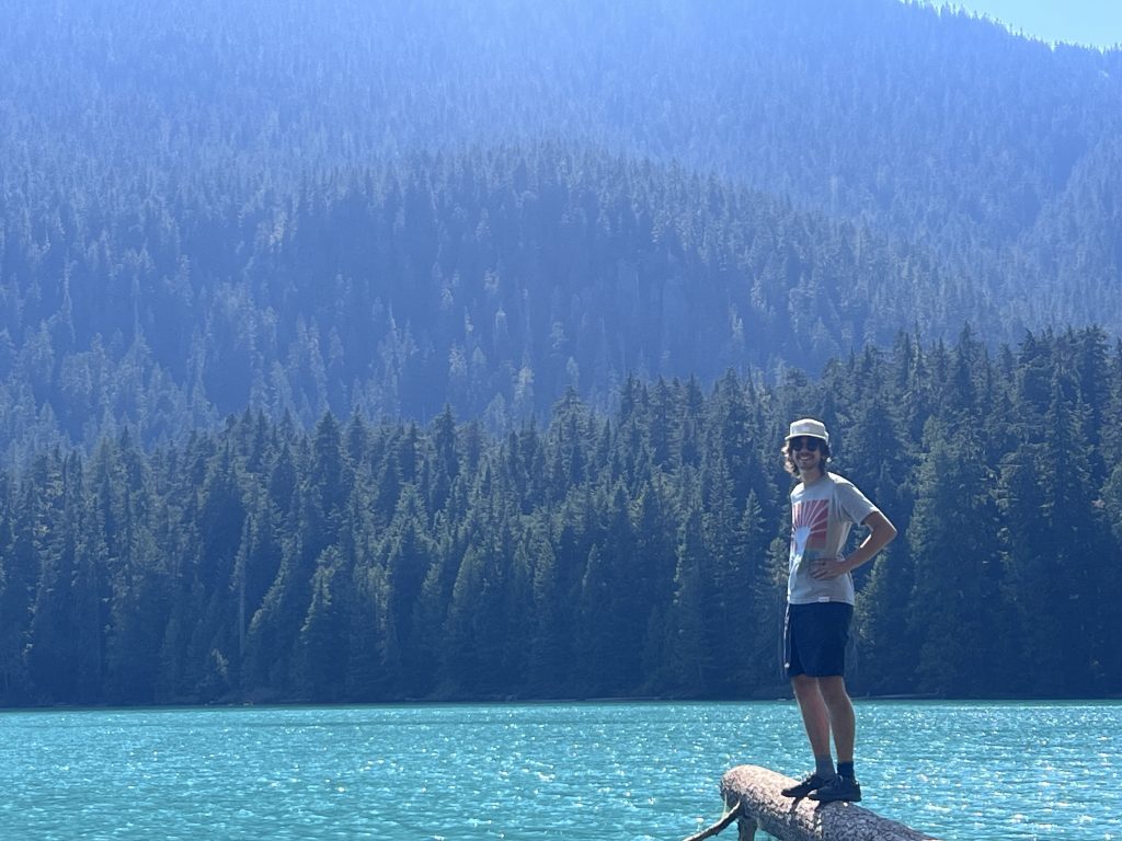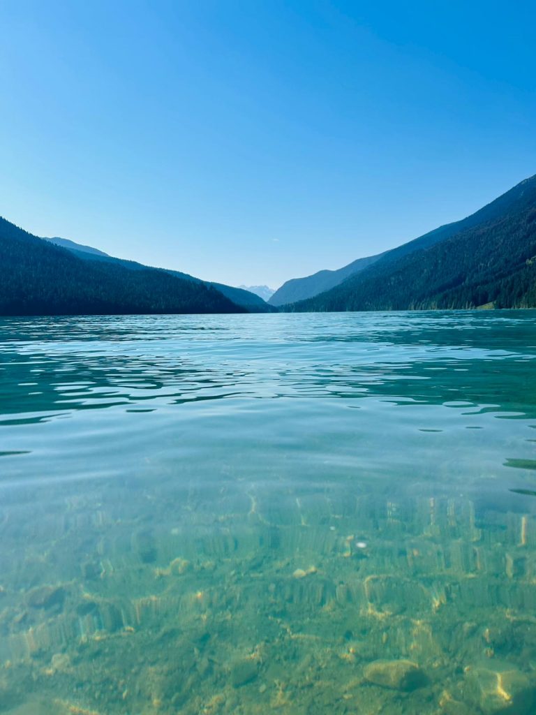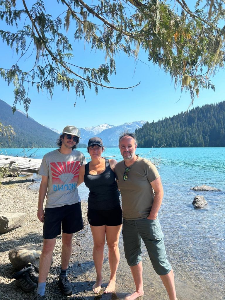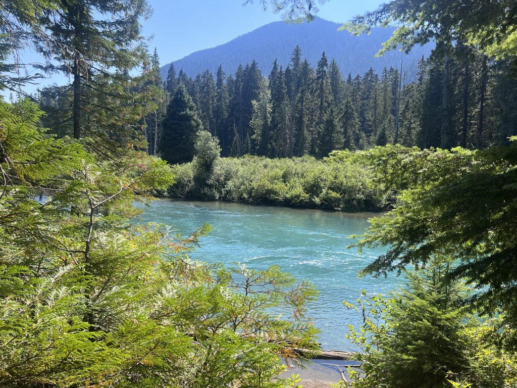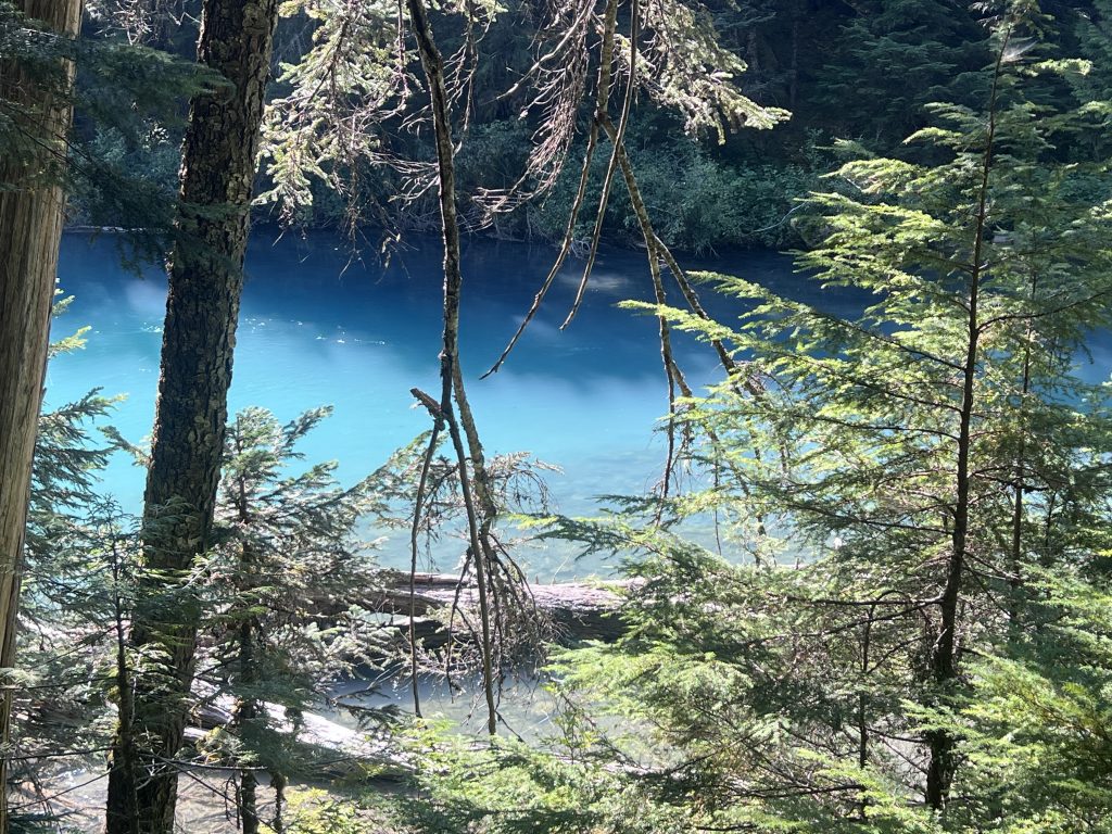 La balade est d’une beauté saisissante ; ma préférée de tout le séjour. La forêt semble constituée de multiples forêts distinctes car d’un versant à l’autre des montagnes les arbres, buissons et fleurs changent en aspect et en nombre. Le lac et la rivière sont alimentés par mille petits torrents issus de la fonte estivale du glacier qui se trouve au-dessus, leur conférant une couleur irréelle, entre le bleu polaire et le turquoise. Nous plongeons parfois les mains dans un torrent pour nous asperger le visage et nous rafraîchir – mais pas trop longtemps car l’eau doit être à 5 degrés. Il faut dire que le thermomètre affiche 31 degrés aujourd’hui ; heureusement que le mercure chute un peu sous les grands arbres et davantage encore quand nous parvient l’écume d’un ruisseau glacé.