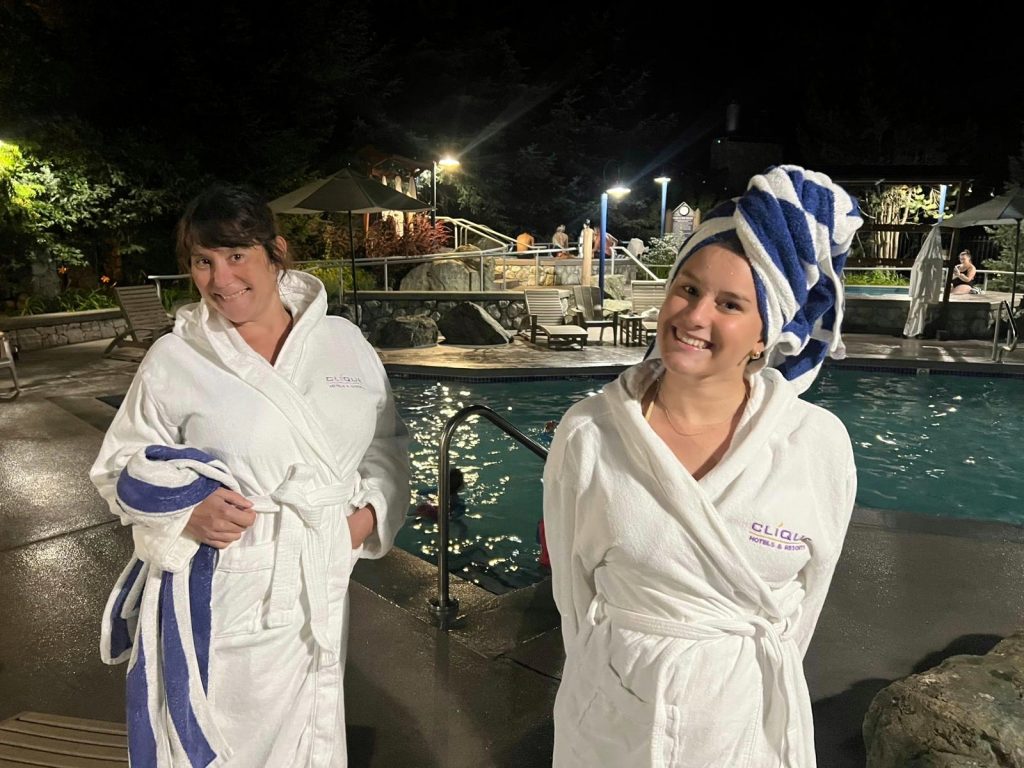 À notre retour à l’hôtel, 19 bornes plus tard, nous retrouvons une Lilix toute fraîche et ravie de sa journée en solo, passée à la salle de sport, à faire la sieste et au bout du fil avec ses amies. Nous posons dans un bruit mol le Vava qui a trouvé la rando belle mais beaucoup trop crevante (d’autant plus qu’on n’a pas déjeuné à midi, seulement grignoté une barre de céréale dans l’aprèm) et sortons nous délasser à la piscine de l’hôtel.